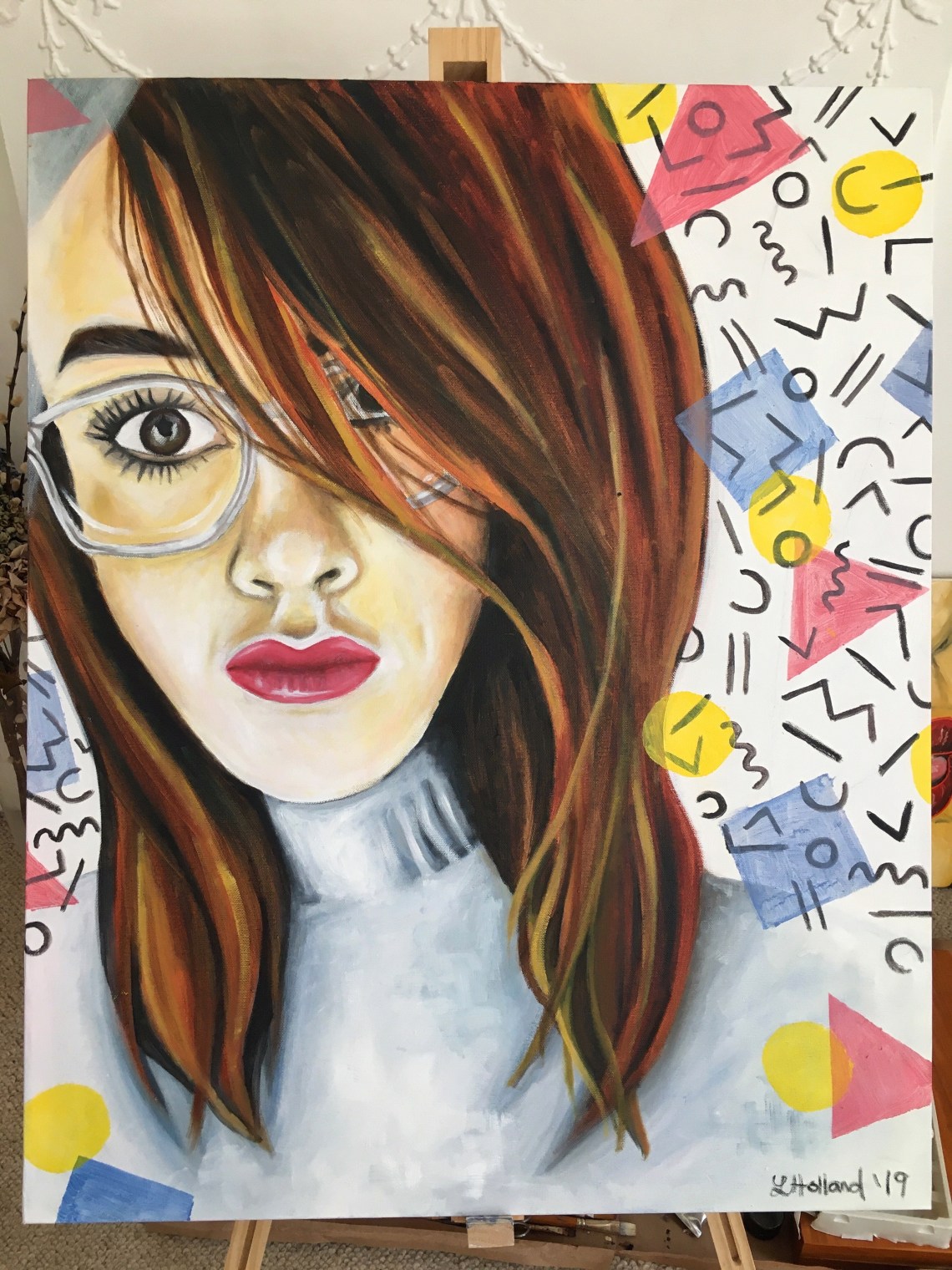 Also within the final touches are the coloured shapes that go over the top of the 80s pattern, I have opted for blue, pink and yellow to pick out the tones in the portrait itself.